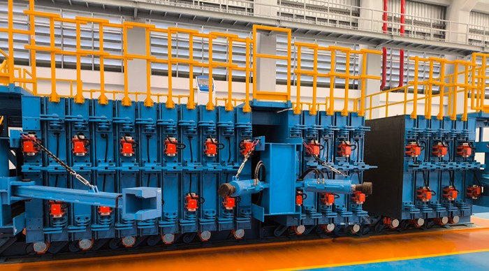 工作原理:模具的開合由下方的液壓機(jī)構(gòu)完成,和墻板機(jī)類似。合模后的鎖緊由上方和兩端的拉桿裝置實現(xiàn)。下方的強(qiáng)制同步裝置保證了大板在開合時的兩側(cè)同步。大板下方的輪組保證了大板在開合時不傾斜、不倒伏。